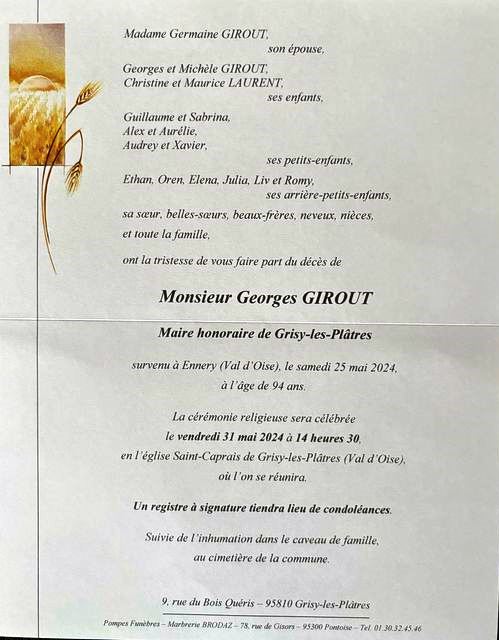 Georges Girout nous a quittés : organisation de ses obsèques à Grisy-les-Plâtres.